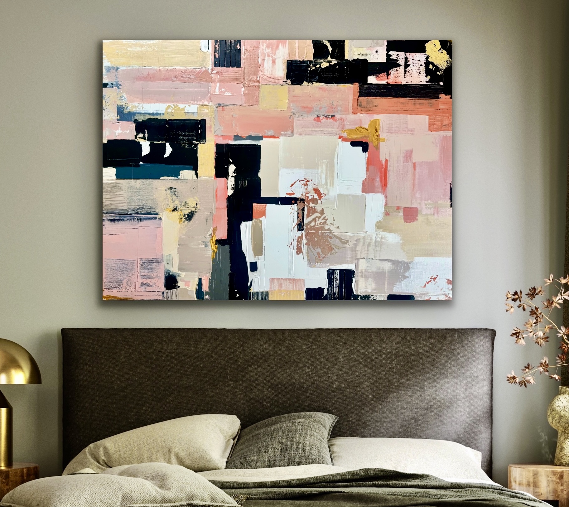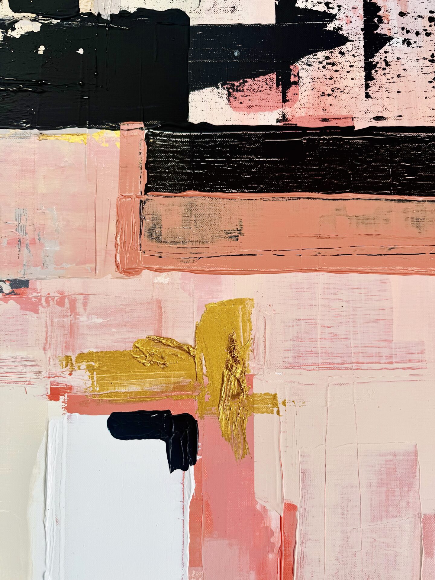 This abstract work explores the transformation from disarray into wholeness. Layered textures and contrasting tones suggest fragments finding their place, shifting from scattered into cohesion. Soft blush and ivory tones meet bold black and ochre, creating a dialogue between vulnerability and strength.